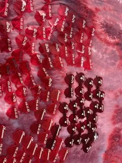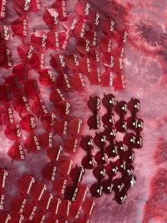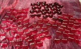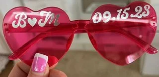 Six red heart-shaped sunglasses with personalized names and dates written on them, placed on a pink background.