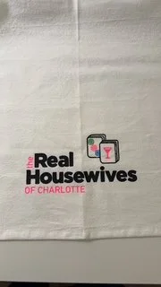 A fabric or paper with the logo of 'The Real Housewives of Charlotte' TV show, featuring the show's title with a pink and black color scheme and a small icon of a wine glass.
