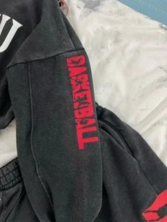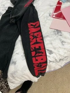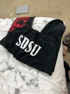 Black hoodie with white 'SDSU' text and red text on the sleeve, laid on a bed with a blue notebook nearby.