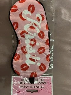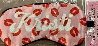 Sleep mask with the name 'Kristi' and lipstick kiss marks.