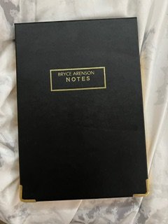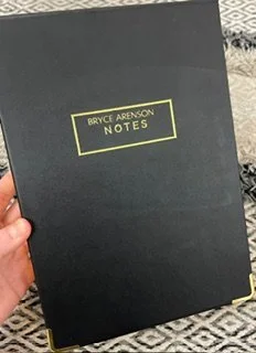 Black notebook with gold edging and a gold-bordered label on the cover that reads 'Bryce Arenson Notes' placed on a fabric surface.
