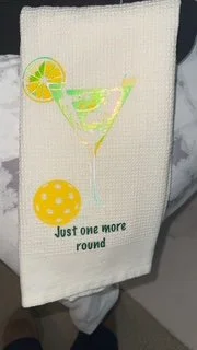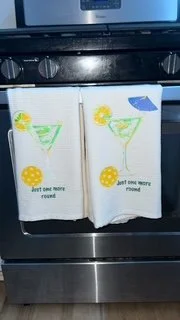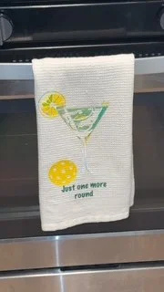 Kitchen dish towel with lemon slice, martini glass with lemon, yellow polka dot, and the words 'Just one more round'.