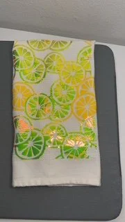 A towel with a lemon slice pattern in shades of yellow, green, and lime.