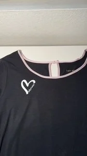 Close-up of a dark-colored shirt with a pink collar and a white heart graphic on the upper left side.