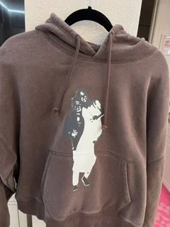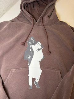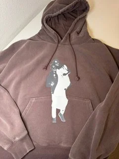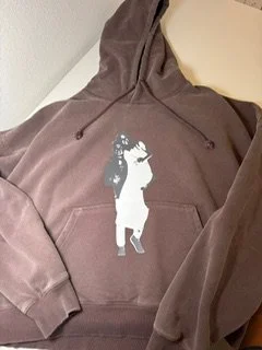Close-up of a brown hoodie with a graphic of a girl walking, carrying a bag, and wearing a hat.
