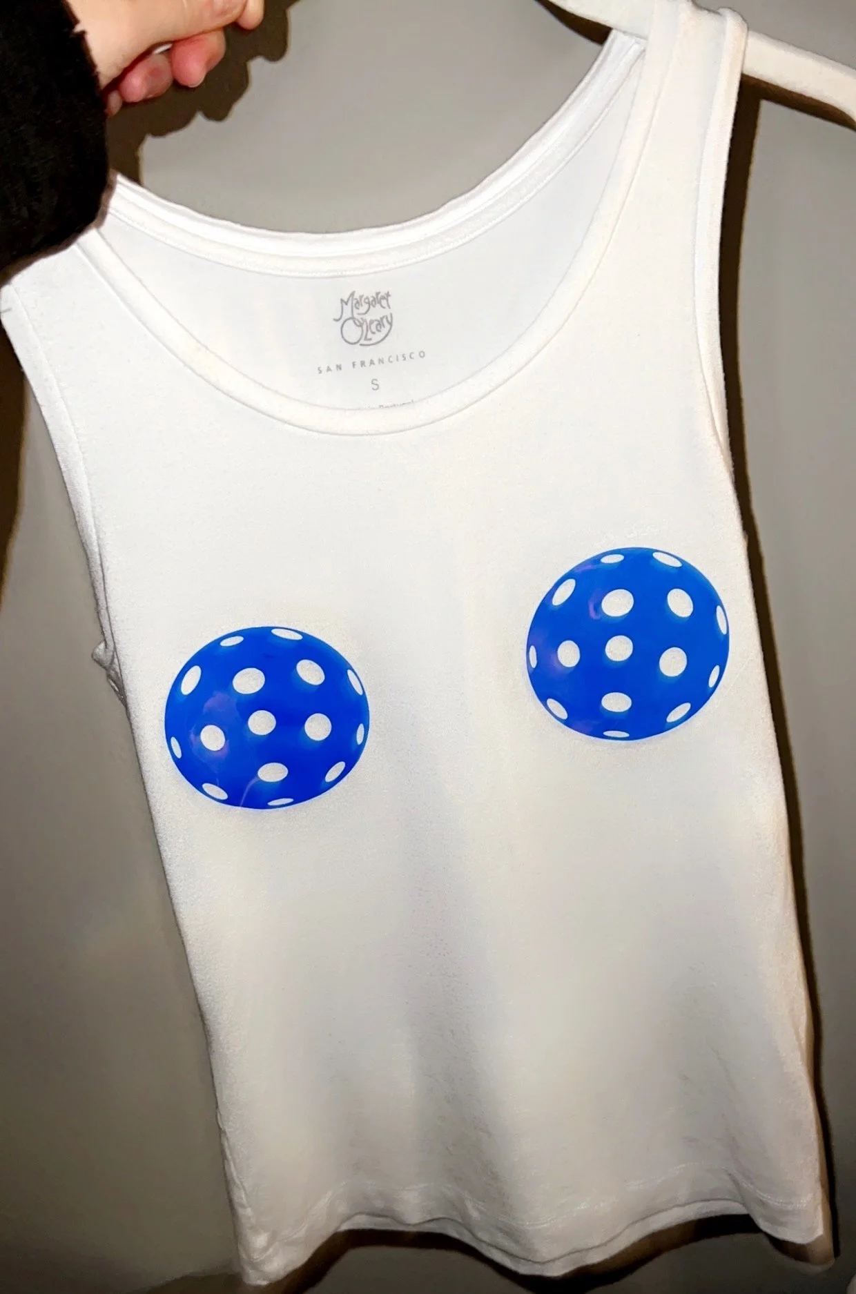 White sleeveless tank top with two blue polka-dotted 3D sphere designs on the front.