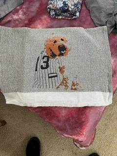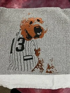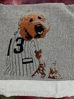 Cross-stitched artwork of a dog wearing a sports jersey with the number 13, holding a baseball bat, on a gray woven background.
