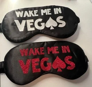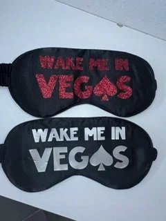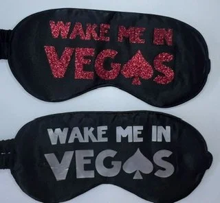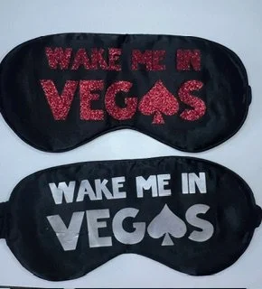 Two sleep masks, one black with red glitter text 'Wake Me in Vegas' and one black with white text 'Wake Me in Vegas' with a spade symbol.