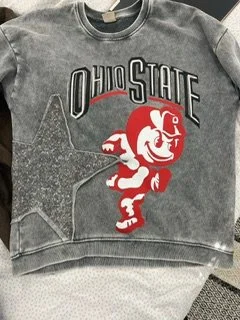 Gray sweatshirt with Ohio State logo and mascot printed on it.