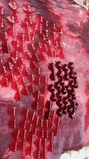 Multiple red and dark-colored chocolates wrapped in foil, spread out on a surface, possibly on a red tablecloth.