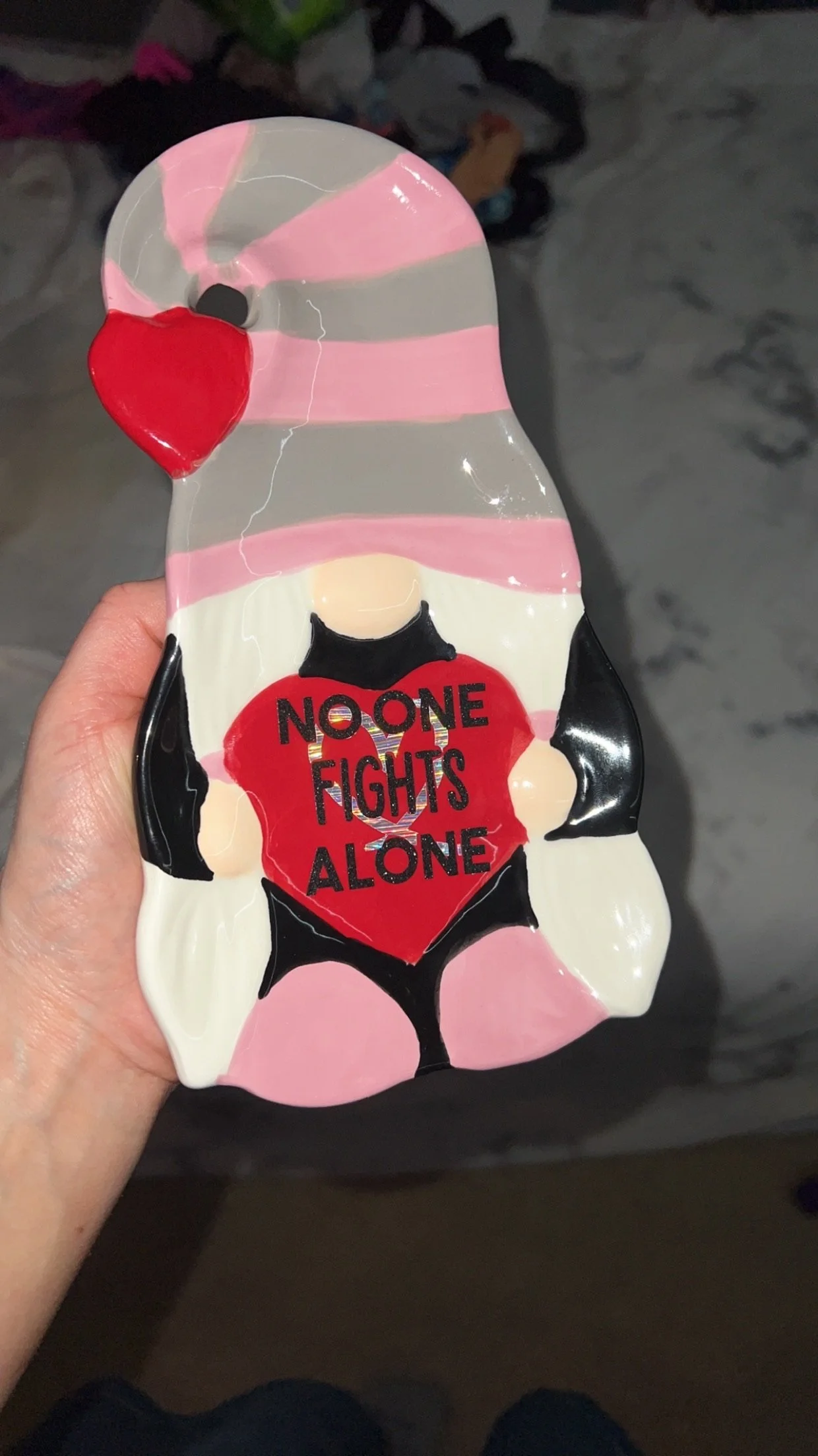 A decorative glass piece shaped like a woman with a large heart on her chest that reads 'No one fights alone', featuring pink, black, white, and red colors.