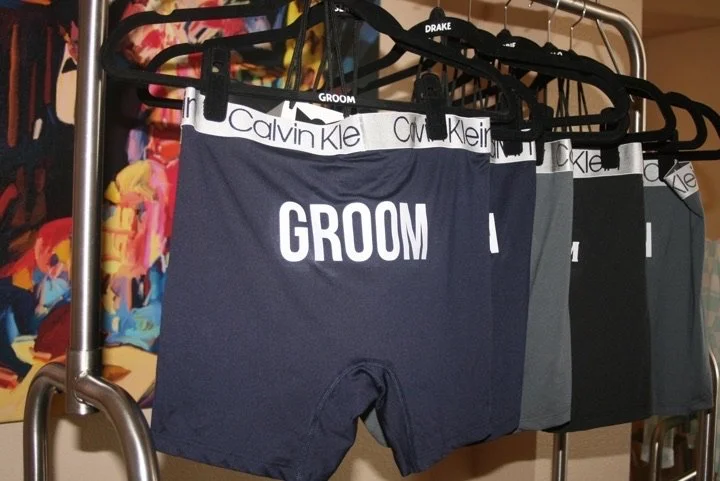 A clothing rack displaying men's underwear with the word 'GROOM' printed on the waistband. The underwear is in various colors, including navy, gray, and black, with Calvin Klein branding visible.