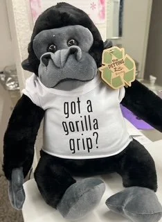 A plush gorilla toy wearing a white T-shirt that says 'got a gorilla grip?'