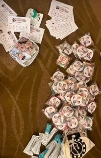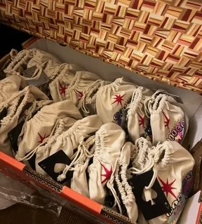 Several white drawstring pouches with colorful star and text designs inside an open cardboard box.