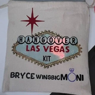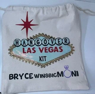 A white fabric bag featuring the iconic Vegas sign design, with the words "HUNGOVER LAS VEGAS KIT" in colorful letters, and the name "BRYCE WINS BIG MONEY" printed below.