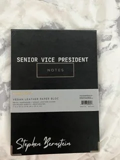A black and white notebook titled 'Senior Vice President Notes' with a label for 'Vegan Leather Paper Bloc' and a signature of Stephen Youngster.