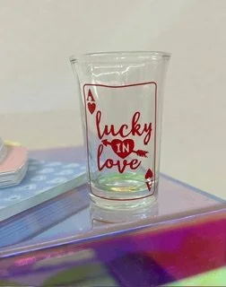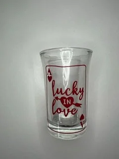 A clear glass with red text saying 'lucky in love' and red heart and spade symbols, empty inside.