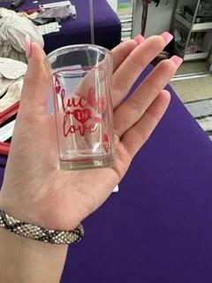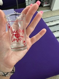 A clear glass with red cursive text that says 'Lucky in Love' being held in a person's hand, with a purple surface and some shelves and objects in the background.