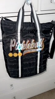 Black tote bag with white straps and a word design on it, hanging against a wall.