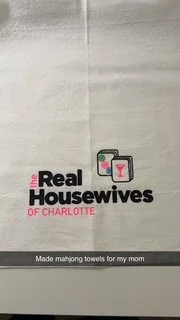 Box of Real Housewives of Charlotte themed Mahjong towels with a pink and black design.