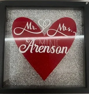 Decorative sign with a red heart shape and white cursive text reading 'Mr. & Mrs. Arenson' inside a black frame.