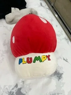 A plush toy resembling a mushroom, with a red cap and white base, and the word 'PLUMPY' embroidered on the front.