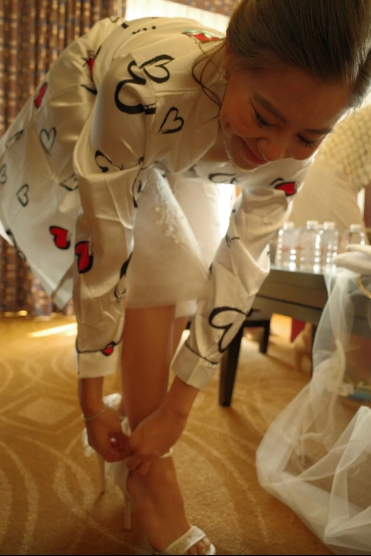 A woman in a white pajama set decorated with red and black hearts, bending down to put on a high-heeled sandal.