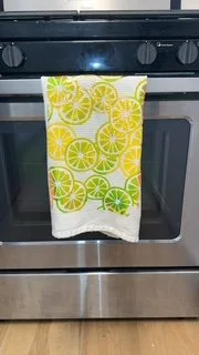 Kitchen oven with a towel hanging on the oven handle, towel has a pattern of yellow and green lemons and lemon slices.