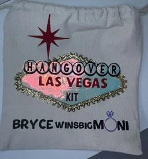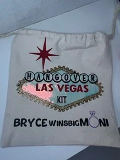 White drawstring bag with a Las Vegas-themed hangover kit logo and branded name Bryce Winsbigoni.