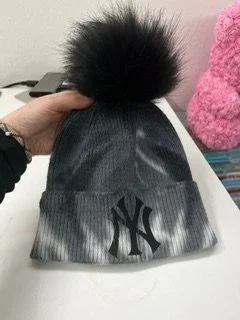 Person holding a gray New York Yankees beanie with a large black pom-pom on top.