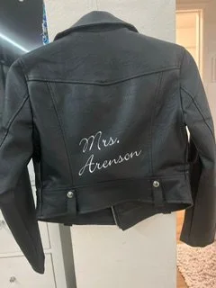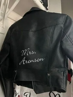 Black leather jacket with 'Mrs. Arenson' embroidered on the back.