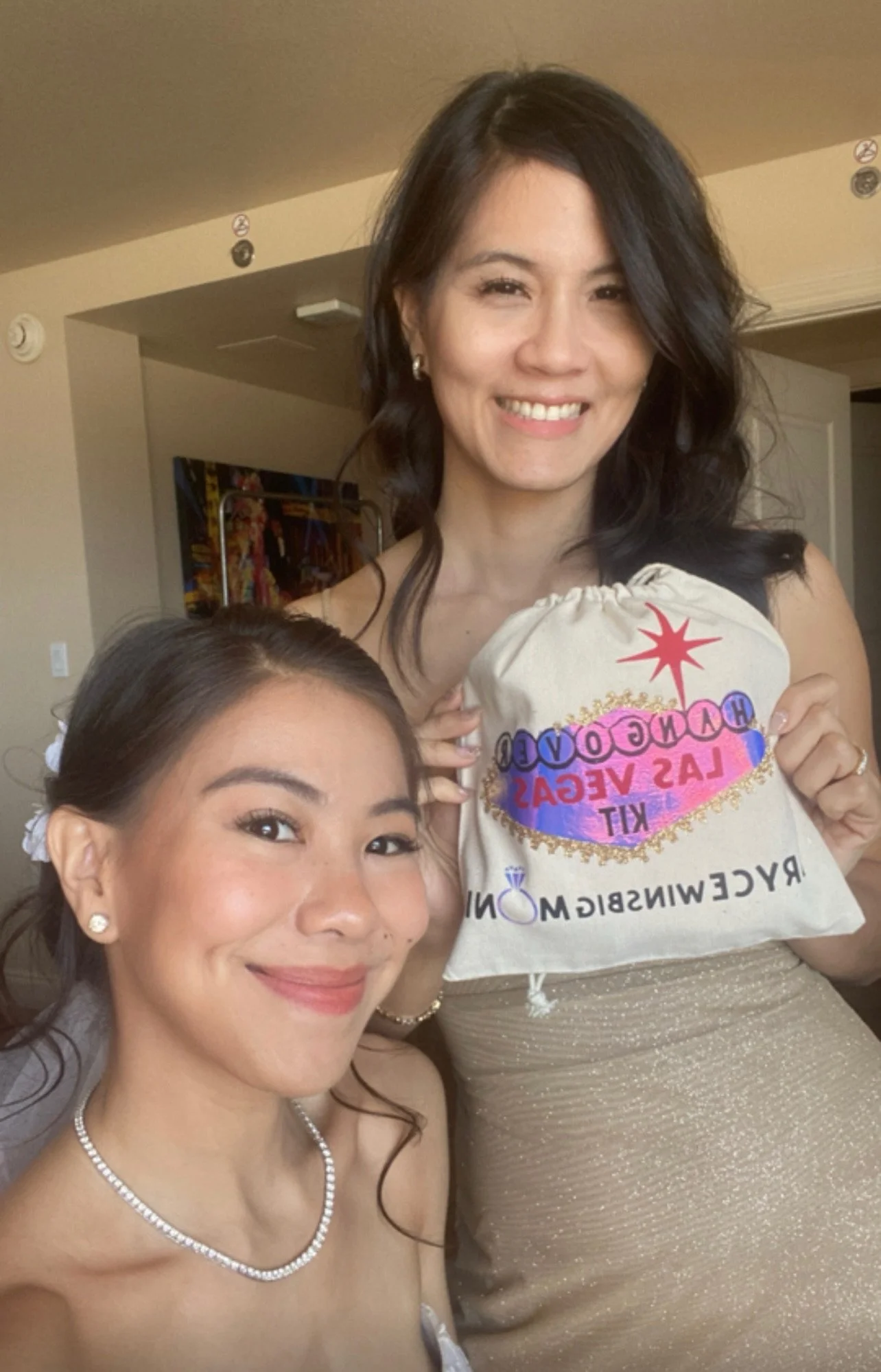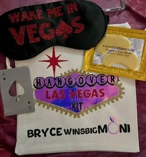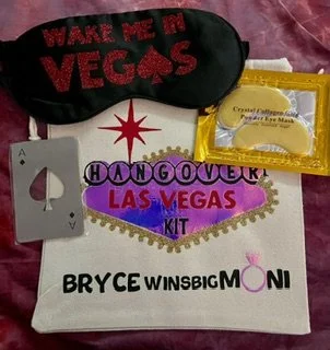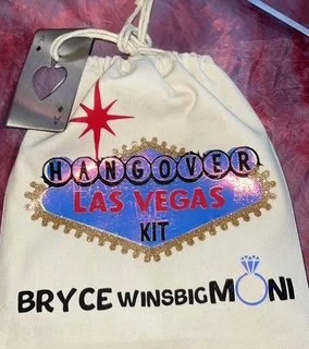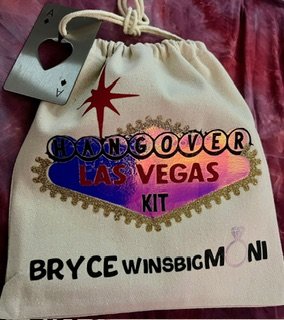 Decorative fabric bag with 'Hangover Las Vegas Kit' and the name 'Bryce Winsbig M' on it.