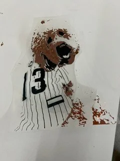 A dog wearing a baseball jersey with the number 13, sitting against a white background.