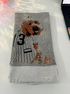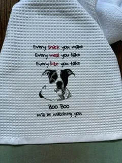 A white textured towel with embroidered text and a dog's face. The text reads, 'Every snack you make, every meal you take, every bite you take, Boo Boo will be watching you.'