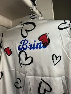 White fabric with black and red hearts, and the word "Bride" embroidered in blue with a red heart.