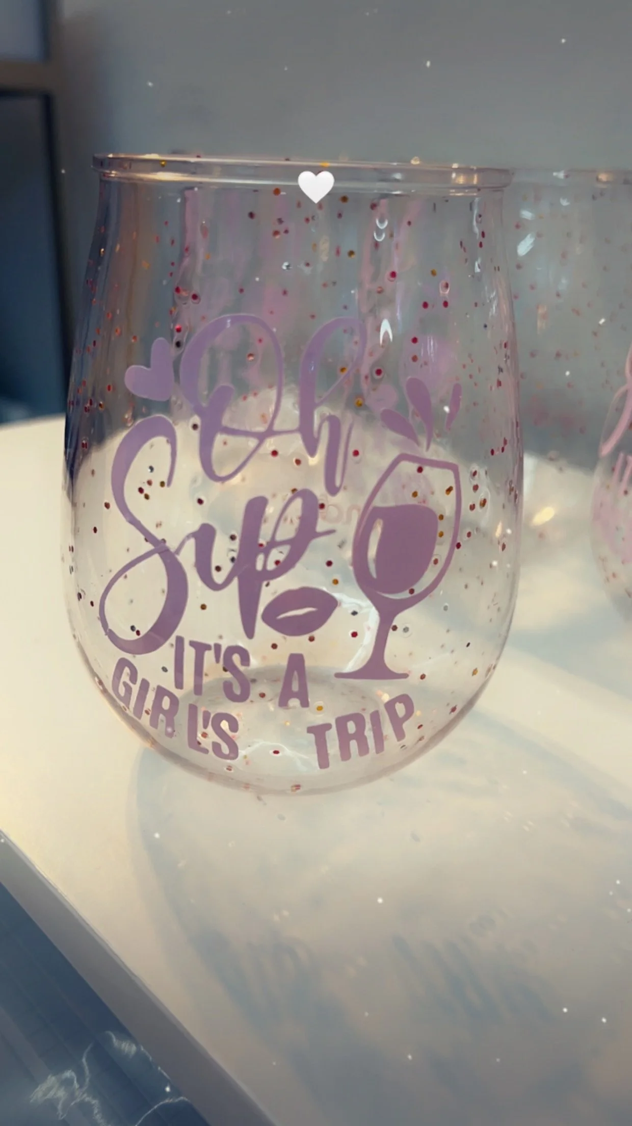 A clear glass with white and pink lettering that says anthro, sup, oh, it's a girls trip, on a counter or table.
