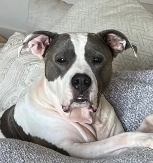 Close-up of a black and white pit bull dog lying on a couch, looking at the camera.