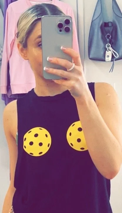 A woman trying on a sleeveless black top with yellow cookie-ice cream cone graphics at a clothing store, taking a mirror selfie with her phone. The background shows hanging clothes and a blue bag.