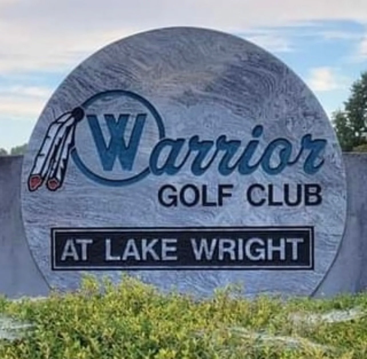 Sign for Warrior Golf Club at Lake Wright with a logo of three golf clubs and a large blue 'W'.