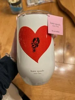 A Kate Spade New York tumbler with a red heart design and a small black logo, held in a hand.