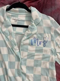 Light blue and white checkered shirt with a collar, embroidery on the left side reading 'Mrs' with a small heart.