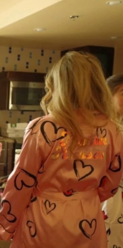 A woman with long blonde hair wearing a pink dress with black hearts, in a kitchen or dining area.