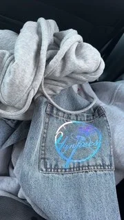Gray hoodie and blue jeans with a heart-shaped holographic patch reading 'Confident' on the back pocket, sitting in a car
