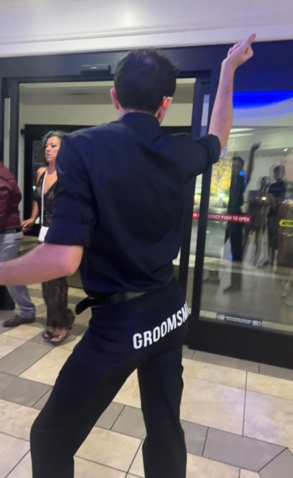 A man in a black shirt and black pants with 'GROOMSM' written on the back, standing inside a building near an exit door, pointing upward with his right arm raised.