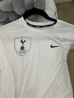 White Nike sports jersey with Tottenham Hotspur logo on the chest and dressed on a hanger