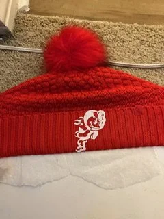 Red knit beanie hat with a pom-pom on top and a white lion logo