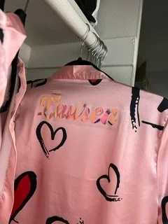 Pink jacket with colorful, glittery letters and black and red heart designs hanging on a rack.